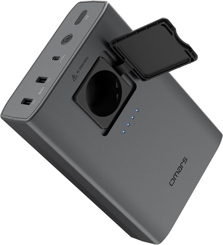 Alimenta em USB, Type-C (18W) e Tomada Schuko (90W max).